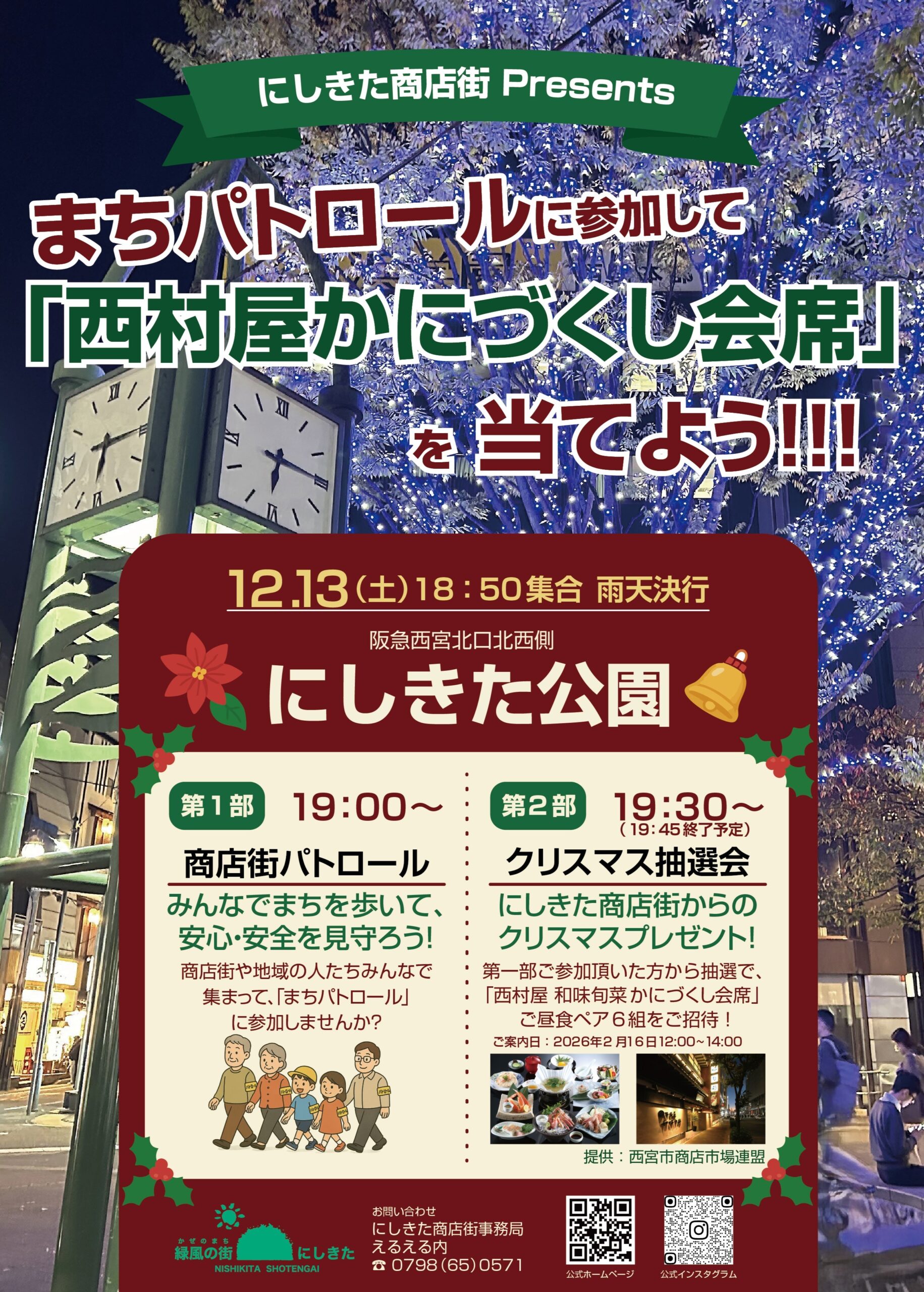 去る12月13日、冬のイベント「まちパトロールにさ参加して、西村屋かにづくし会席を当てよう!!!」を開催しました。